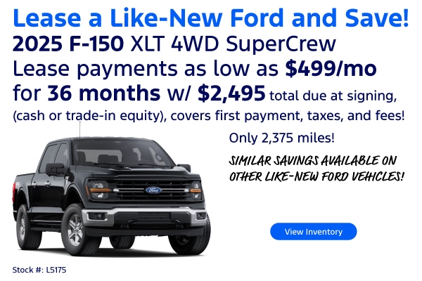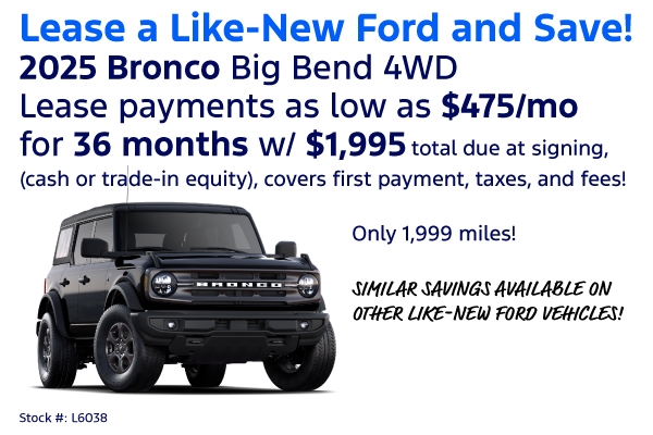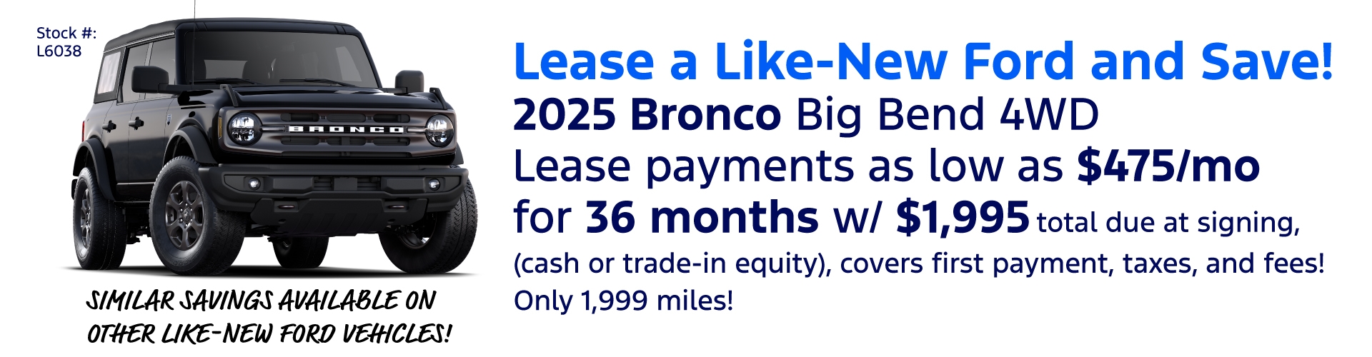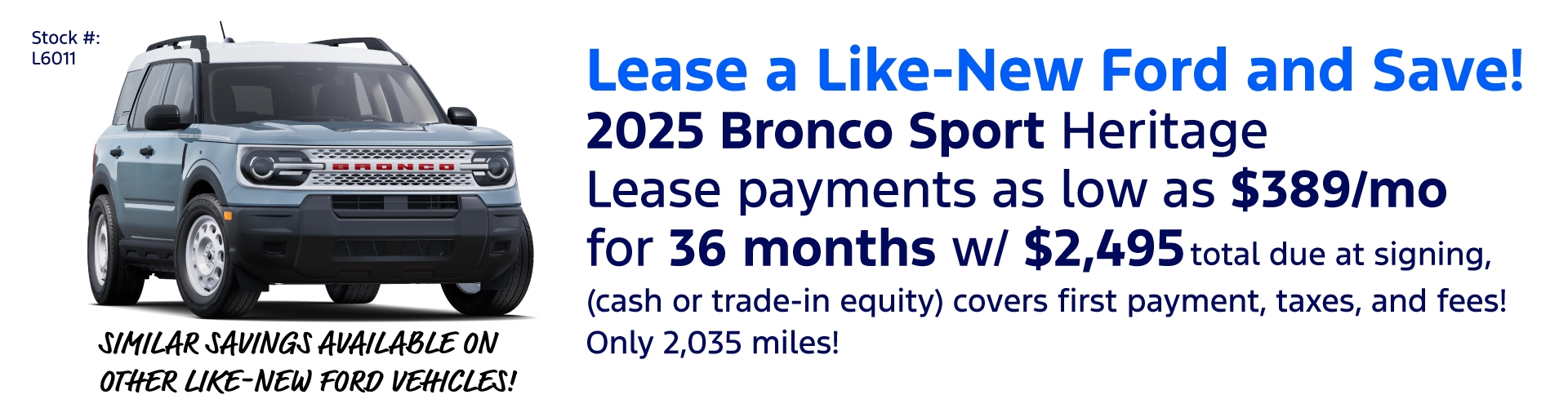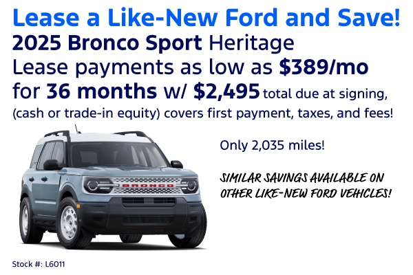 Dealer Offer: Lease this 2025 Ford Bronco Sport Heritage (Model #: R9G) (Stock#L6011). MSRP $36,985 with $2,495 down at $389 per month for 36 months with approved credit. Cap cost of $34,876. $0 security deposit. $2,495 total due at signing includes first payment, estimated taxes, and average fees of $285.00 (including estimated registration and license fees, title fee, and $175 dealer documentation fee). Lessee responsible for maintenance, repairs, excessive wear and tear, and excess mileage over 10,500 miles/year at the rate of $0.20/mile. Early lease termination fee may apply. Total monthly payments are $14,004. Residual value at lease end is $20,851.20. Ford rebates of $2,250 included ($1,500 Ford Bonus Customer Cash and $750 Ford RCL Customer Cash). Ford Financing available through Ford Motor Credit Company. Offers cannot be combined with any other advertised offer. See dealer for complete details. Residential restrictions may apply. In stock units only. See dealer for a complete list of coverage details and limitations. Offer Expires: 3/31/2026